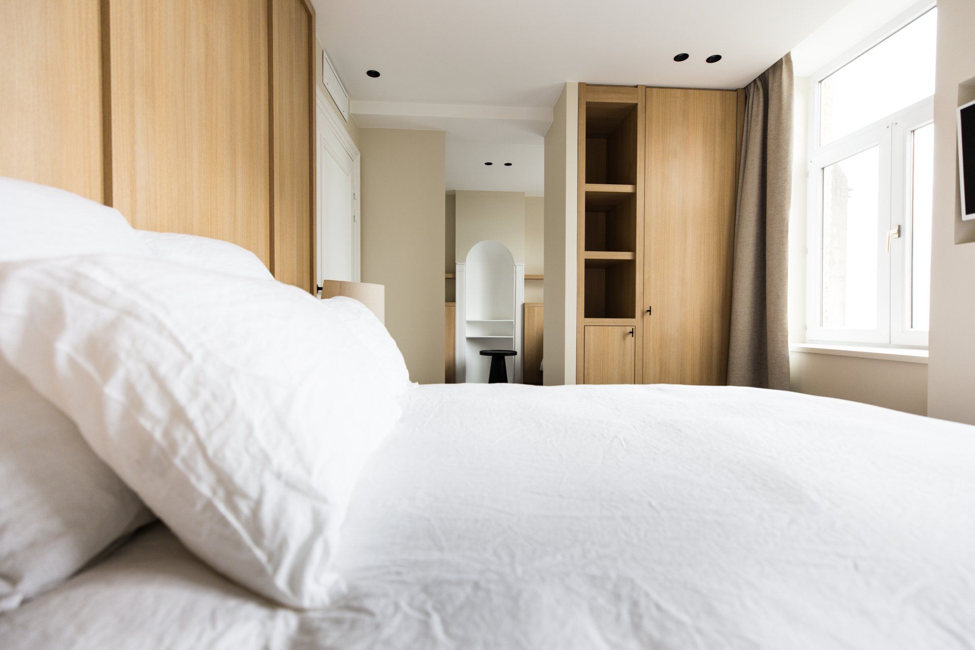 La chambre principale, avec le lit, 160 sur 200 cm, est tournée uniquement vers l'horizon des Flandres, en plein sud, vue inédite sur le jardin.